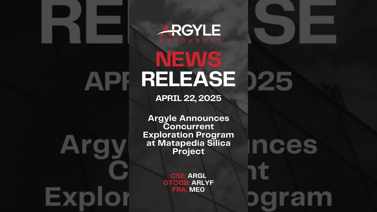 News Release | April 22, 2025 | Argyle Resources (CSE: ARGL | OTCQB: ARLYF | FRA: ME0) VideoMining 0 Share FacebookTwitterGoogle+ReddItWhatsAppPinterestEmail Check on YouTube 0 Share FacebookTwitterGoogle+ReddItWhatsAppPinterestEmail